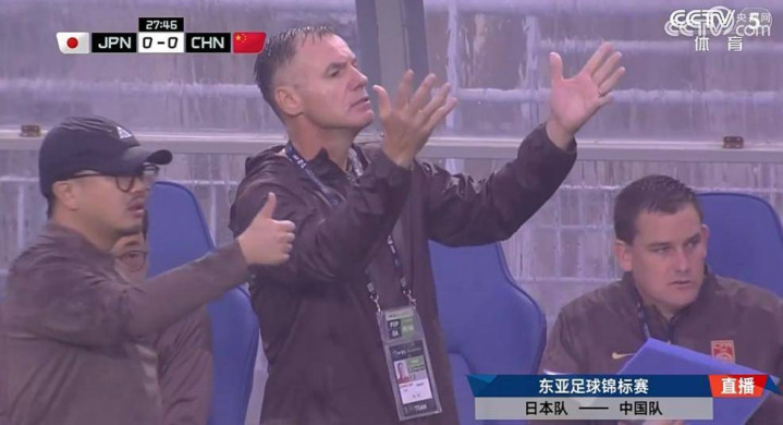 中国女足主帅米利西奇(中)在场边指挥。